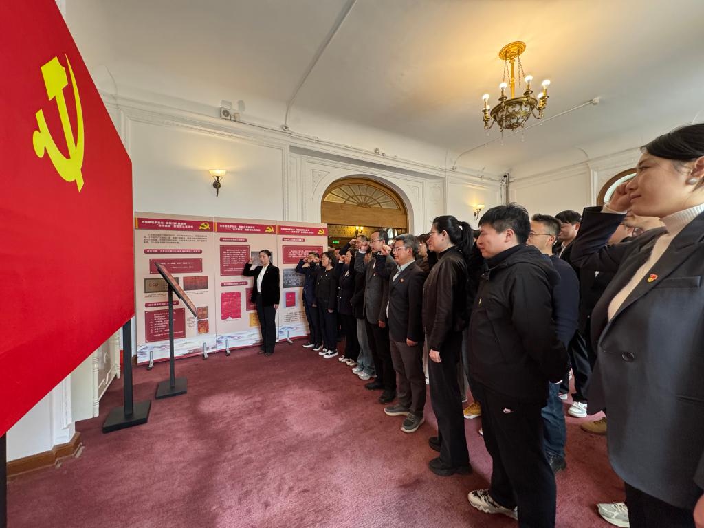 纪念馆内,在讲解员的讲解下,党员们怀着无比崇敬的心情依次参观了三大主题展厅,透过珍贵文物、影像资料及手稿,党员们重温了党的光辉历程,现场接受了党的纪律教育,深切感受到革命领袖们艰苦奋斗的革命精神和求真务实的工作作风。参观结束后,全体党员齐聚庄严肃穆的宣誓厅,在学院党委书记王娟的领誓下,面对鲜红党旗,全体党员高举右拳,重温入党誓词,铿锵的誓言在展厅内回荡。