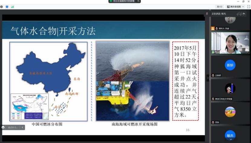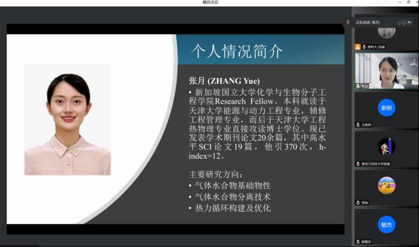 张月助理研究员通过“腾讯会议”网络平台带来了一场题为《Gas Hydrates: Chance or Challenge?(气体水合物:机遇还是挑战?)》的精彩学术讲座。报告中,张月助理研究员首先介绍了气体水合物技术的研究历程,随后从气体水合物&全球变暖、气体水合物开采方法、气体水合物实验模拟、气体水合物碳捕集技术等方面详细讲解了气体水合物的研究现状、技术难点与应用趋势。