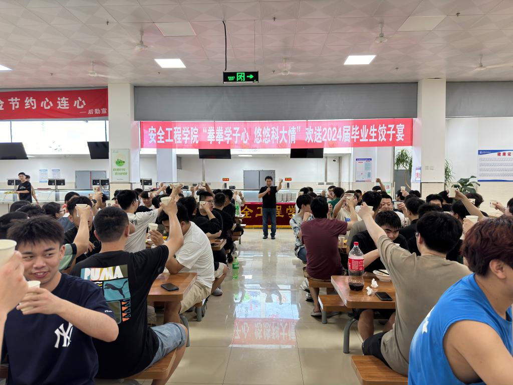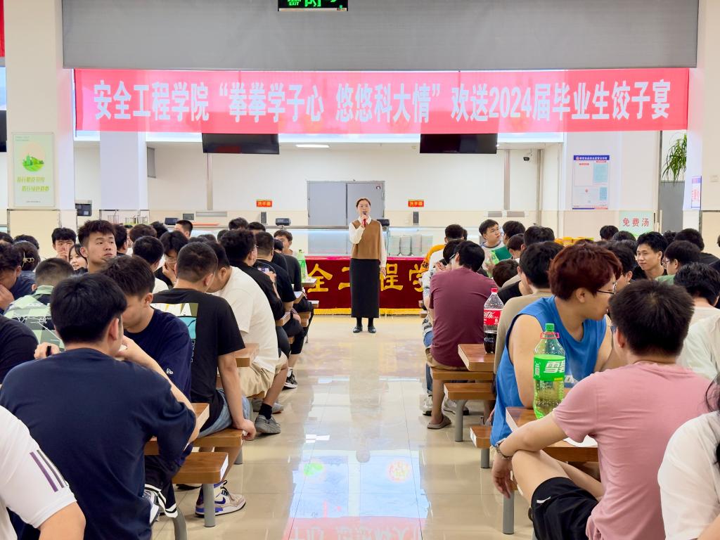 一份暖心饺子,同叙母校深情。为了表达学院对毕业生的殷切期望和美好祝愿,营造和谐温馨的毕业氛围,安全工程学院在沁香园食堂举办了毕业生饺子宴,送别2024届毕业生踏上新征程。饺子宴上,王娟书记向圆满完成学业,即将奔赴远大前程的同学们表示衷心祝贺,勉励毕业生们始终秉承“厚德博学、强吾兴邦”的担当和执着,“自强不息、创业创新”的风骨和坚韧。愿毕业生们将母校的叮咛放入行囊,此去经年,相逢如故;未来平安喜乐,万事胜意!在校生用歌声为毕业生学长们送上了毕业祝福,两位毕业生学长也用歌声回应着在校生的深情厚谊,表达着对学弟学妹们的感谢与不舍以及对过往校园时光的怀念和眷恋。悠悠饺子香,浓浓科大情。这不仅仅是一个结束,更是新起点的开始。相信在未来的道路上,安全学子定会展现出他们的才华与勇气,创造出属于自己的辉煌篇章!