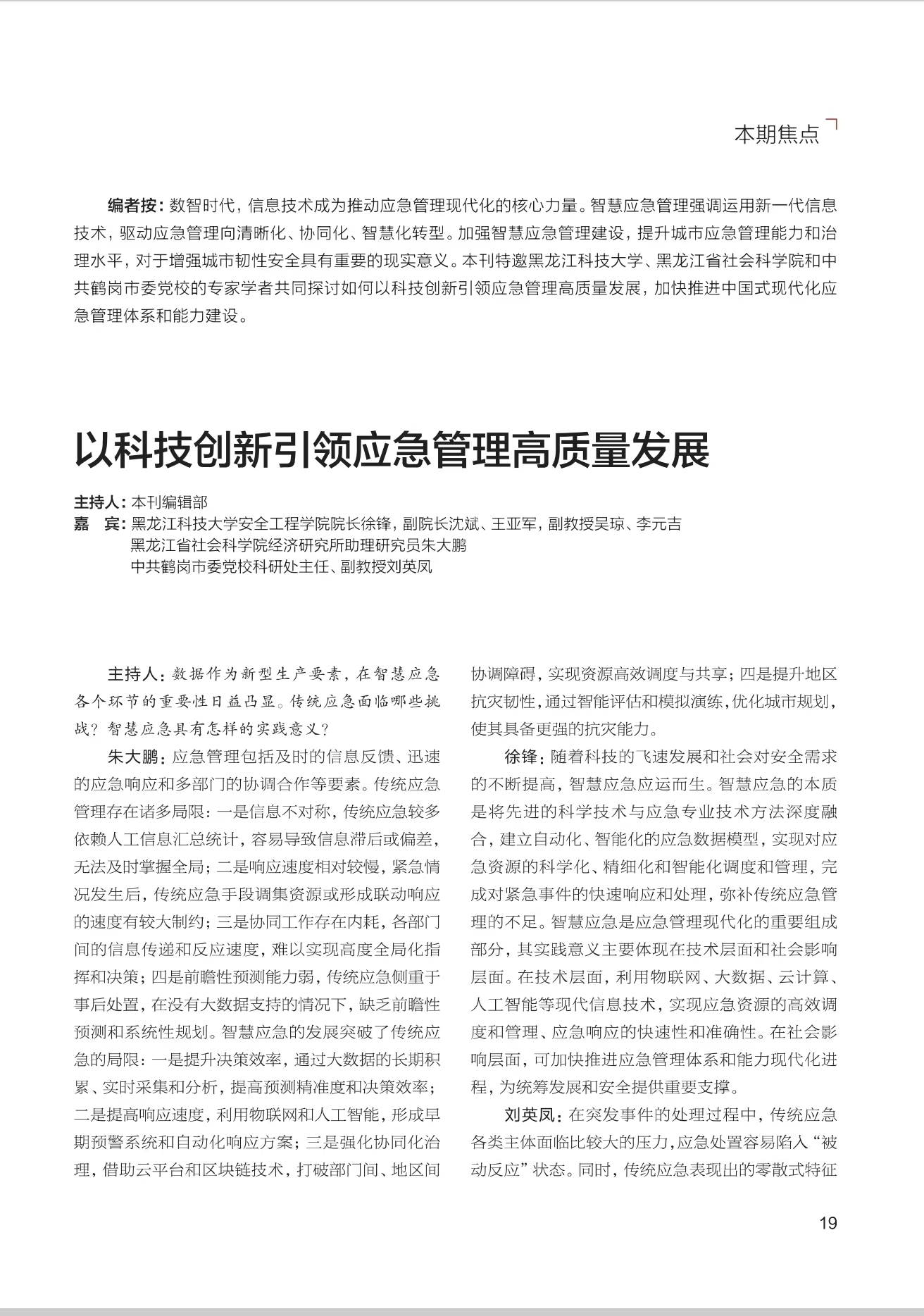 日前,应《龙江应急》邀请,安全工程学院徐锋教授、沈斌教授、王亚军教授、吴琼副教授和李元吉副教授参加龙江应急圆桌专家访谈,并在《龙江应急》2024年第12期刊发其访谈内容。