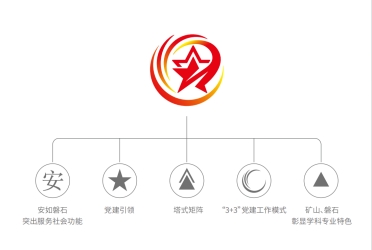 在标识中,三角形元素象征着矿山和磐石,不仅彰显了学科专业特色,也寓意着稳固与力量。象征着学院党委在学院学科发展中的引领作用,体现了在推动学科专业发展、培养专业人才、服务社会需求等方面的坚强领导和不懈追求。