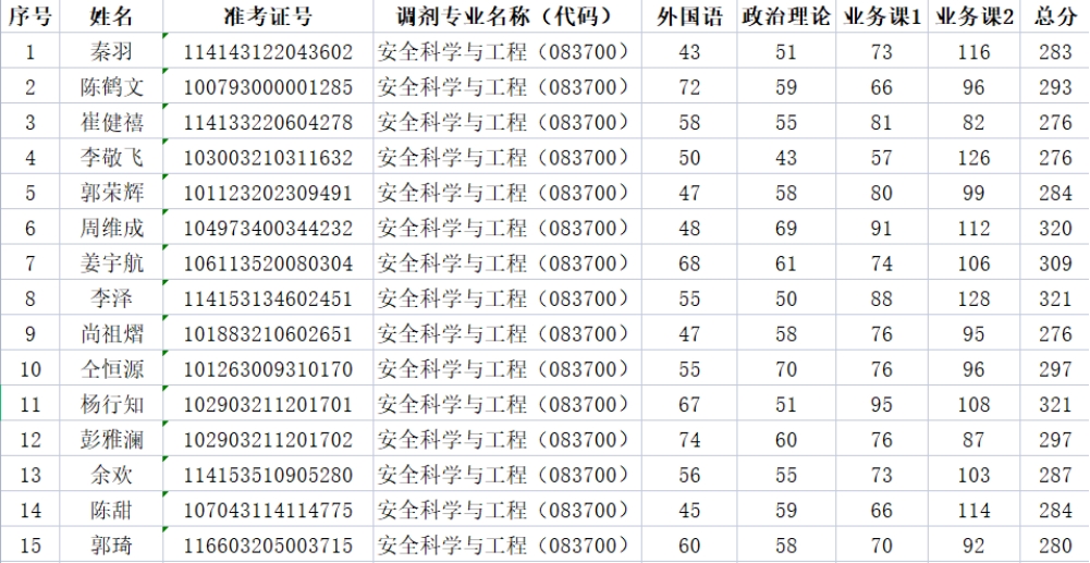 经安全工程学院研究生招生工作领导小组审核,以下考生可参加beat365安全科学与工程专业调剂复试,名单公示如下: