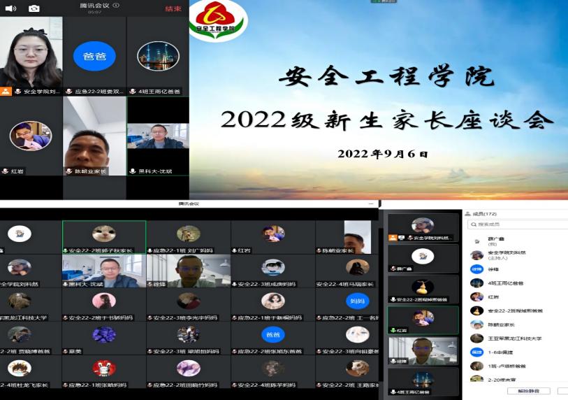 安全工程学院于9月6日晚19:00-20:30通过腾讯会议举行了线上新生家长座谈会,会议由安全学院党委副书记郑红岩主持,150余位家长参加了会议。