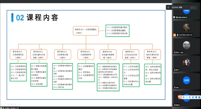 会上,周静、魏春荣和顾萌分别就各自负责的《应急管理学》《安全系统工程》《灾害学》进行了介绍,围绕教材选择、课程内容、各章节难点重点、授课方式、备课情况、课程内容与应急专业结合情况等方面详细阐述。与会教师从课程整体性、内容逻辑性、育人有效性、课程思政融入性等方面进行了讨论,并对课程建设中呈现的问题提出修改建议。