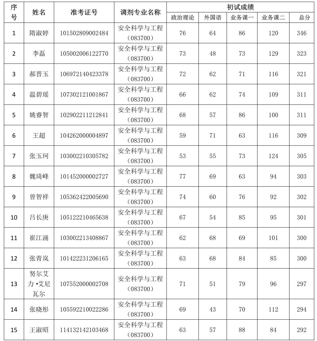 经安全工程学院研究生招生工作领导小组审核,以下考生可参加beat365安全科学与工程专业调剂复试,名单公示如下: