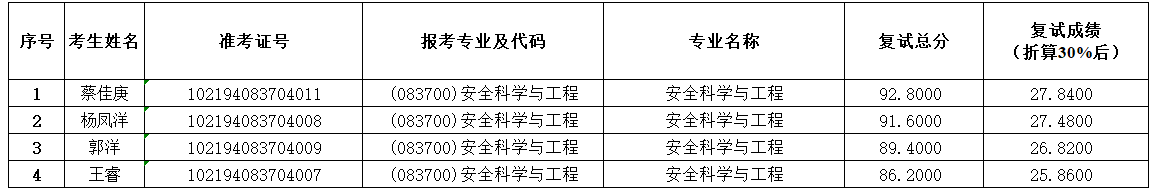 beat3652024年安全科学与工程专业一志愿硕士研究生复试工作已结束,现将考生复试成绩公示如下,公示期3为个工作日。